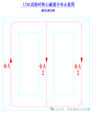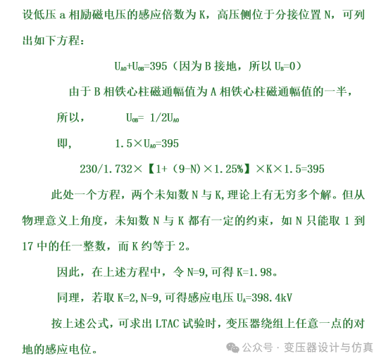 The key points for LTAC test wiring are as follows: 1) The LTAC test must be conducted phase by phase, performing single-phase induction withstand voltage tests with an induction multiple of approximately 2 times. When the exact 2 times induction multiple cannot be achieved, a permissible margin of error is allowed. 2)Taking the high-voltage A-phase LTAC test as an example, a voltage Uax is applied across terminals a and x, with x grounded and b/c terminals left open. The high-voltage B/C terminals are shorted and grounded, while the high-voltage A terminal and neutral (0-phase) terminal remain open. 3)The high-voltage winding must be positioned at a specific tap position as per design specifications to ensure the primary terminal A generates the required test voltage of 395kV [with a permissible deviation of ±3%]. 3.3 Calculation Process According to Faraday's law of electromagnetic induction and the principle of magnetic flux continuity, it is known that the magnetic flux of the iron core column of phase B and phase C is half of that of phase A, and the direction is opposite. Therefore, the induced voltage of the coil of phase B and phase C is half of that of phase A.